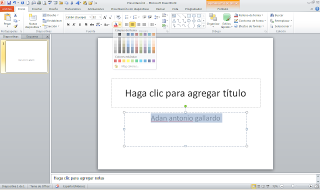 Haz clic en el recuadro de la diapositiva en el cual quieras insertar el texto, automáticamente el texto que aparecía (Haga clic para agregar titulo) desaparecerá y aparecerá el punto de inserción.